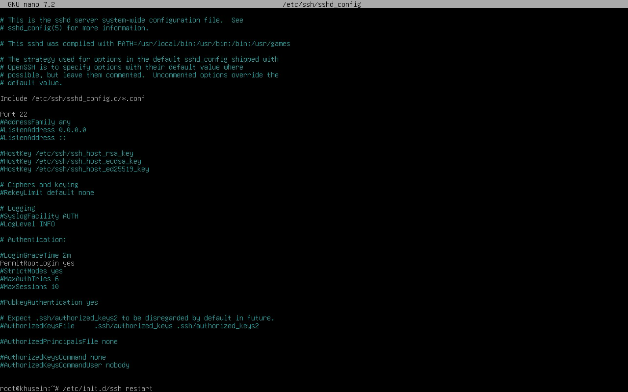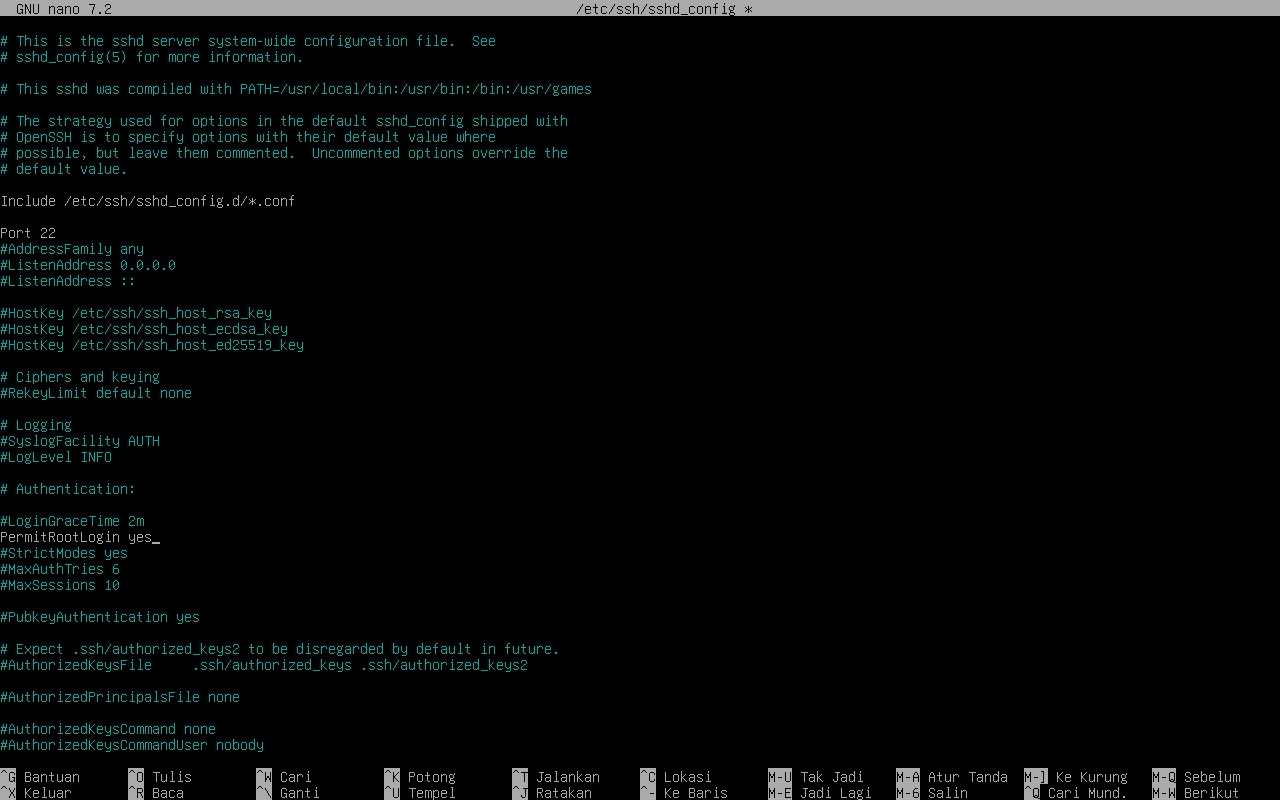 5. Setelah itu kalian tunggu sampai proses selesai, jika sudah selesai kalian masukkan perintah "nano /etc/ssh/sshd_config". Kemudian dibagian ini kalian hapus ( # ) pada "port 22" dan "PermitRootLogin". Kemudian pada kata "PermitRootLogin" kalian tambahkan yes dibelakang kata tersebut. Lalu "Ctrl+x" dan "y" untuk menyimpan lalu Enter.