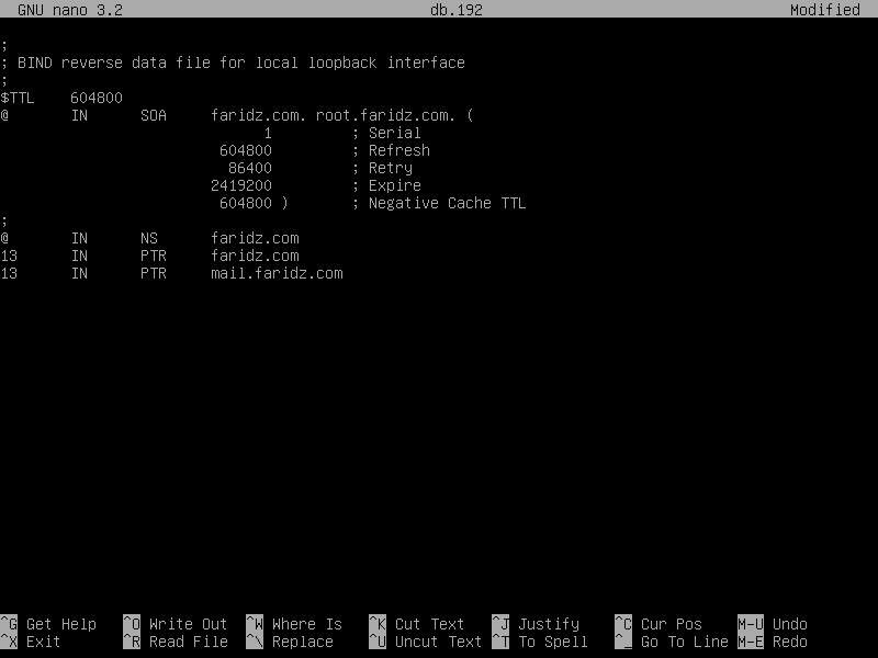 18.Tambahkan perintah "16 IN PTR mail.(user).net" di bagian paling bawah, tekan ctrl+s dan ctrl+x,